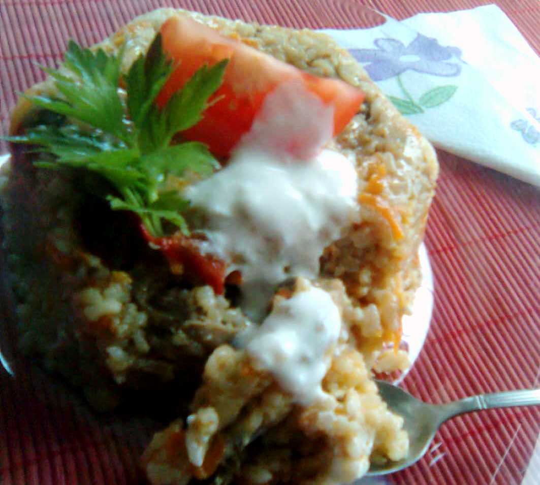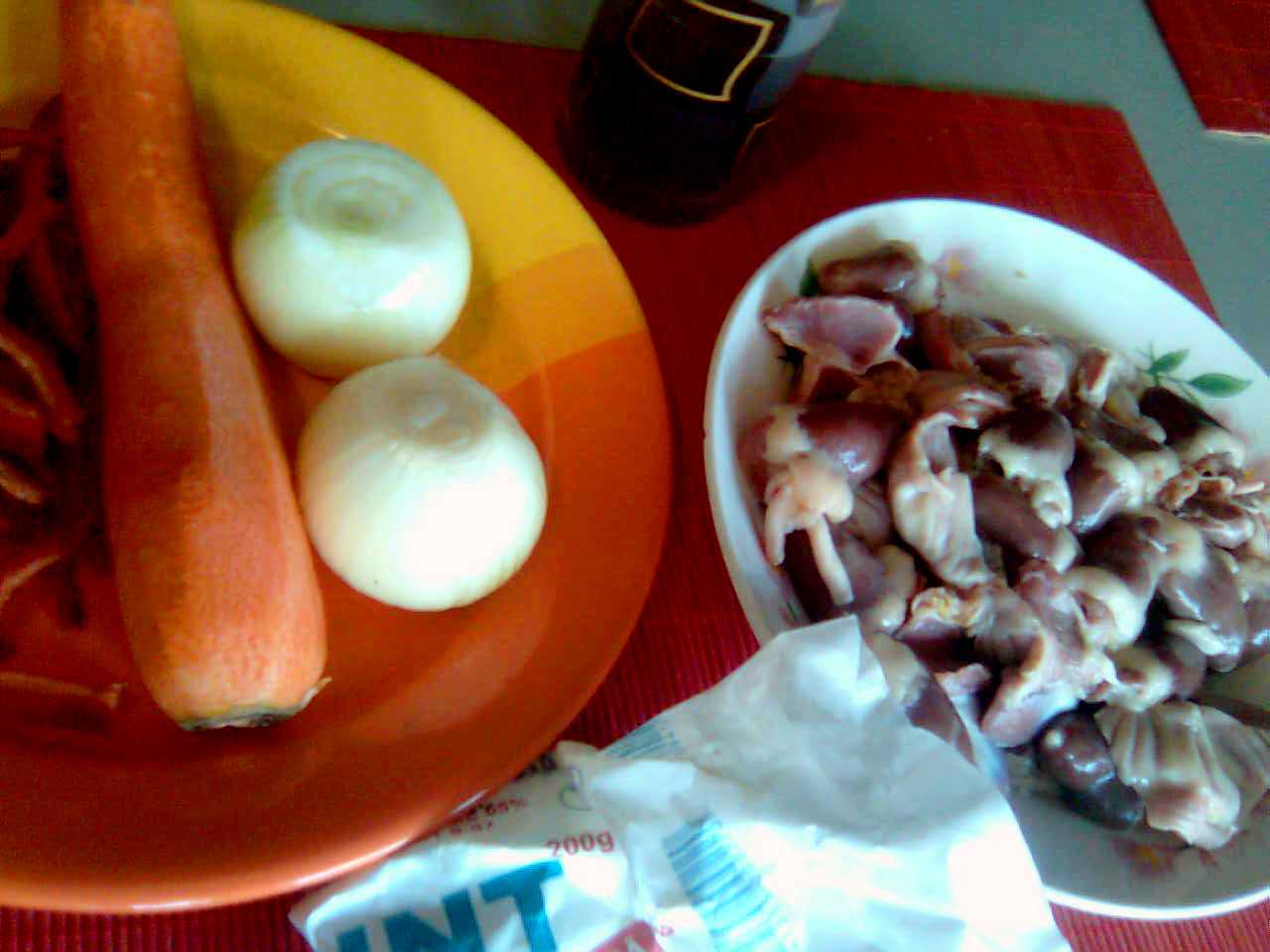 - Pune orezul la fiert in apa cu un praf de sare.Spala maruntaiele in apa rece.Incinge untul si rumeneste organele impreuna cu nucsoara macinata.Lasa sa se inabuse cateva minute .Toarna vinul si lasa pe foc pana cand organele sunt gata.