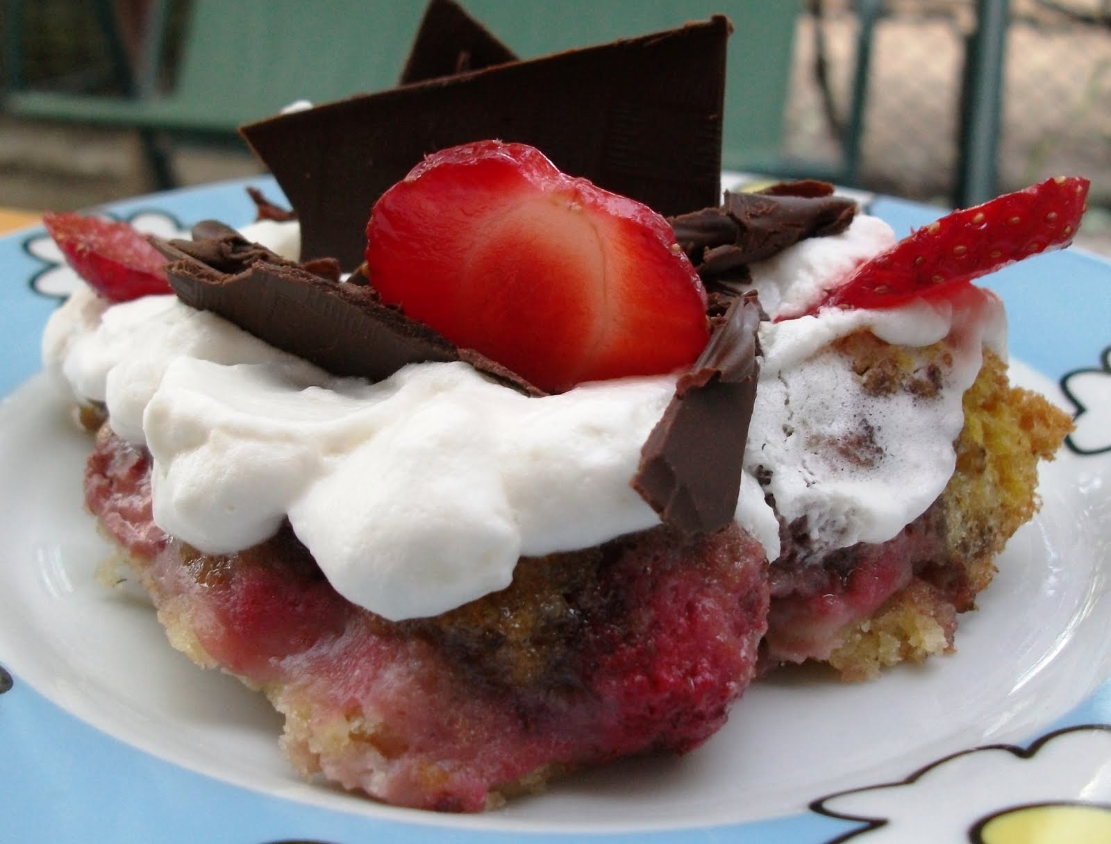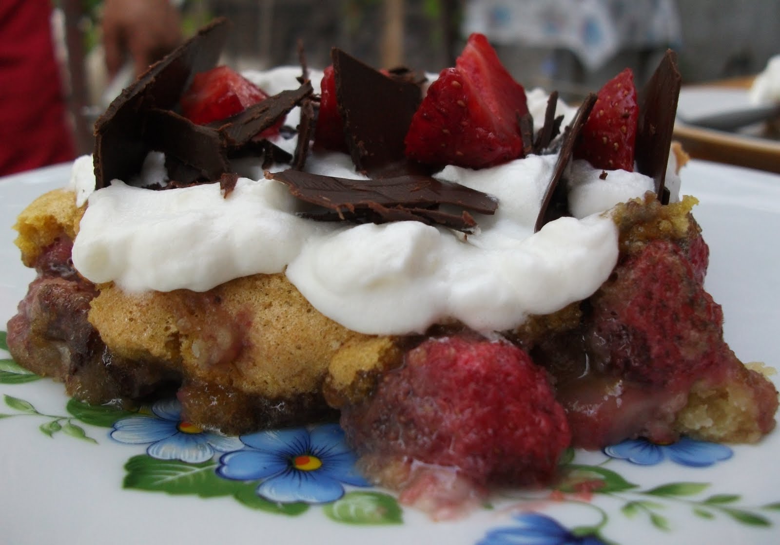 Ei bine,este vorba despre o prajitura cu o foaie frageda,gen biscuit,un strat generos de capsune inobilate cu niscai miere si un strat subtirel de pandispan din pesmet.Se mananca rece,de fapt foarte rece,dupa ce a stat la frigider cateva ore,stiu ca poate o sa fiti tentati sa o gustati asa calda,aburinda,dar o sa fiti oarecum dezamagiti,va fi doar o toropeala fierbinte si nimic mai mult.E si mai buna cu frisca,ciocolata sau inghetata.Asta ramane la alegerea voastra.Si inca un mic sfat:Nu fiti zgarciti(asa cum am fost eu),cumparati capsune mari,frumoase,putin dulci,carnoase,nu zemoase,caci altfel riscati sa-si lase prea multa zeama si sa iasa un pic mai "altfel"...In rest...Pofta buna!