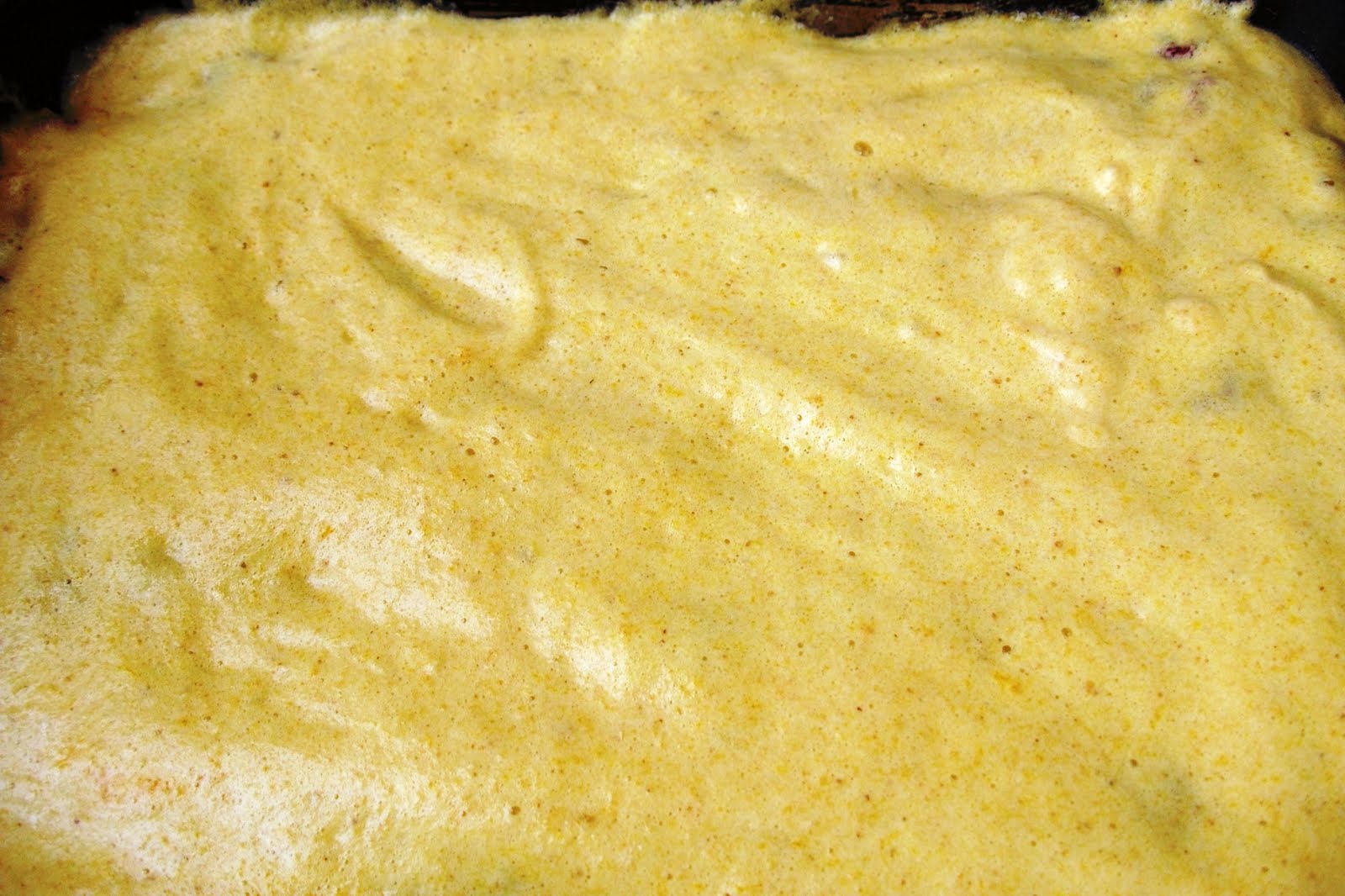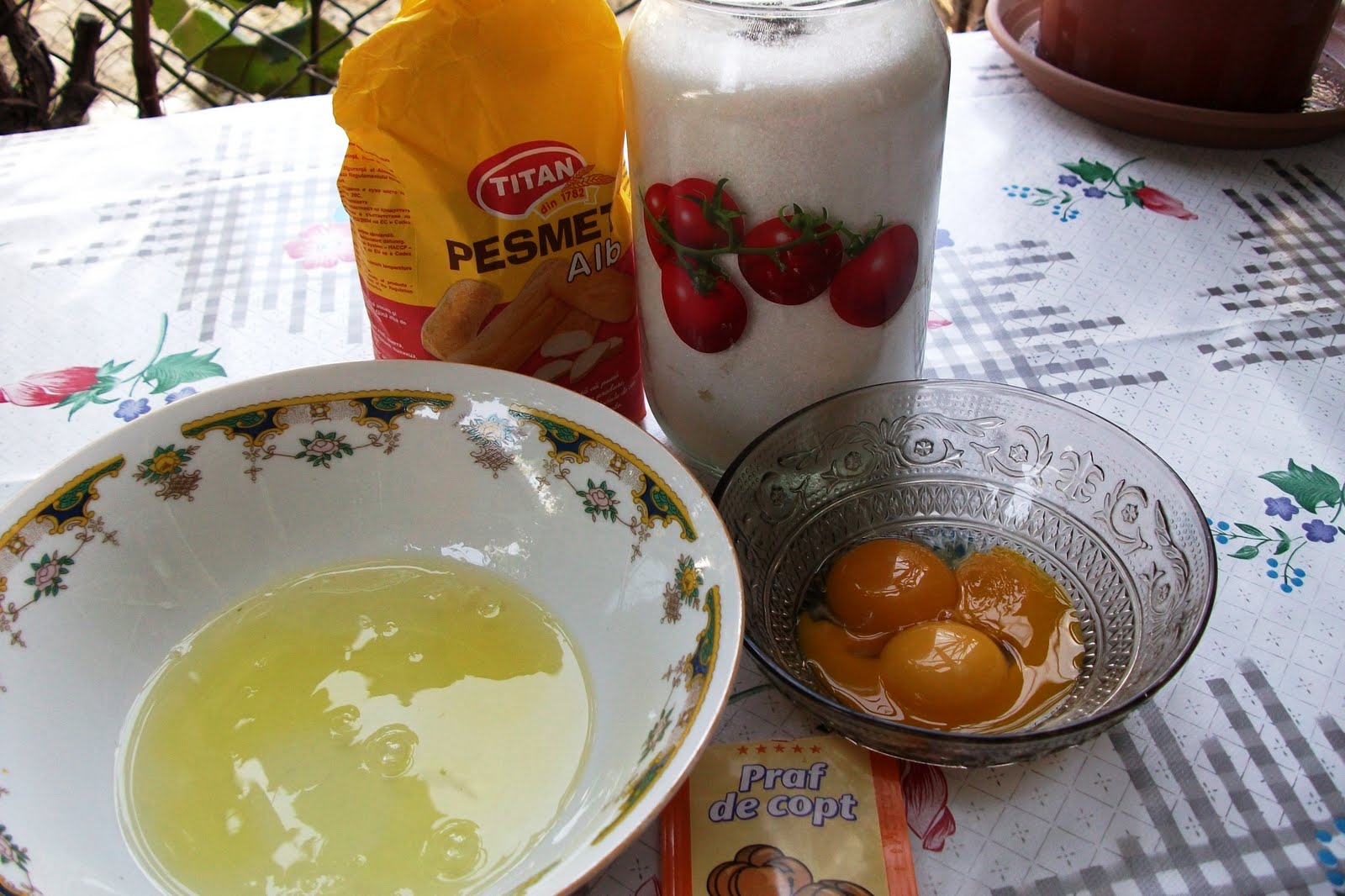 cu 3 galbenusuri frecate cu 5 linguri de zahar,1/2 plic praf de copt si 4 albusuri batute bine,peste care presari 5 linguri cu varf de pesmet.