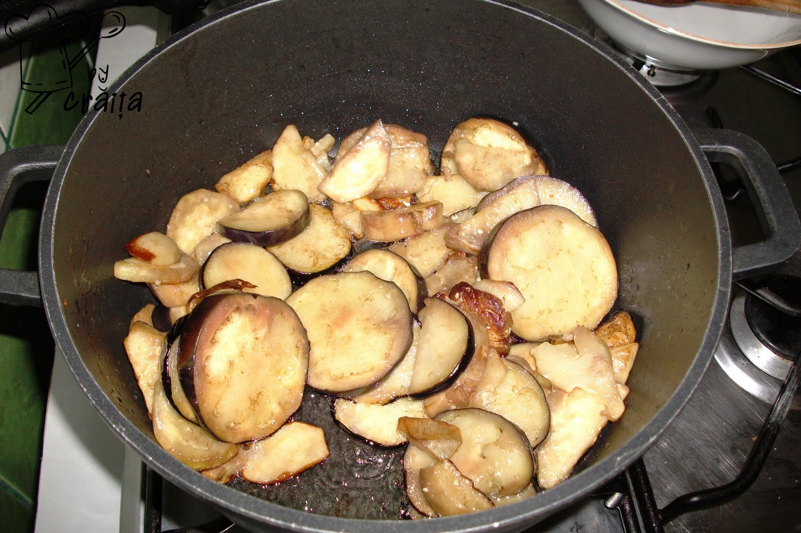 Intre timp am portionat un piept de pui de vreo 500 gr si am taiat 2 cepe.Am scos si vinetele din debara,le-am spalat coaja bine,bine si le-am taiat rondele,le-am calit putin,pana s-au inmuiat.