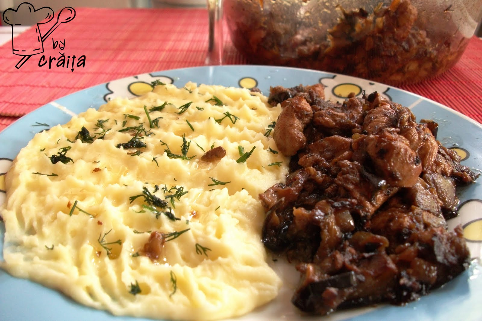 Pui picant cu vinete si piure de cartofi