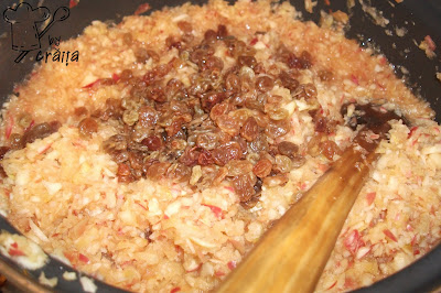 Wash the apples and remove the seeds ,put them in the food processor or you could scrape them.Sauté the apples for 5-10 min adding 1 cup sugar,cinnamon, raisins and lemon zest.