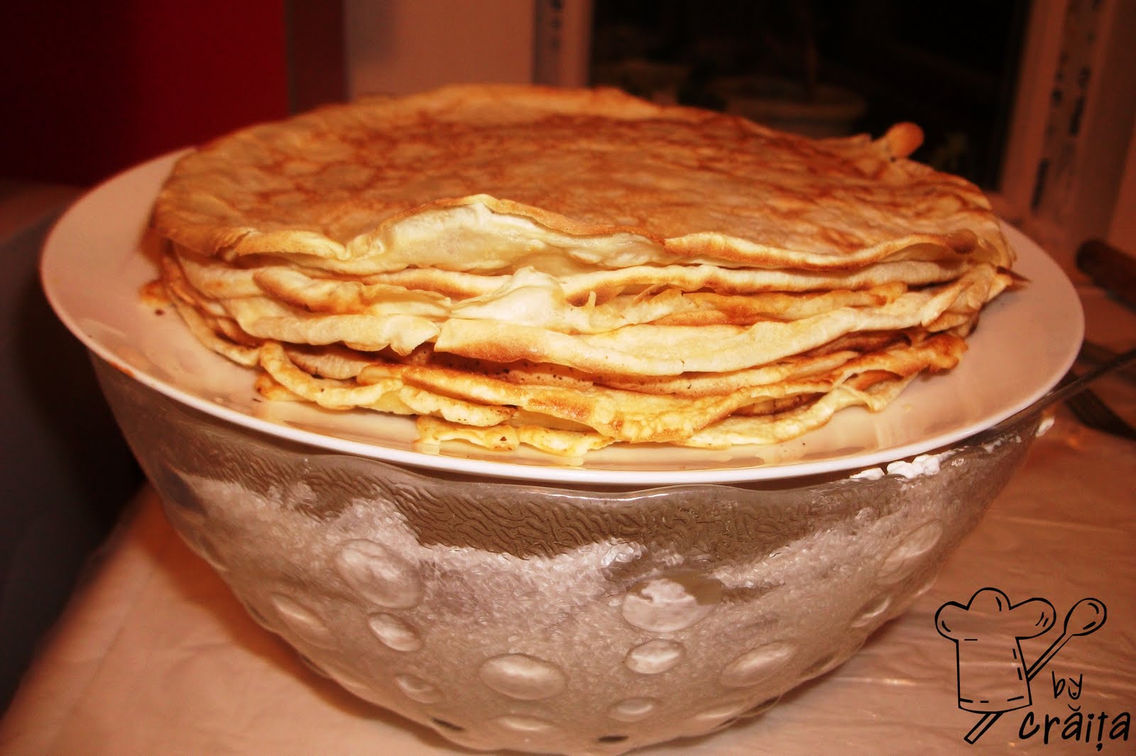 Intr-un bol se bat bine ouale cu sarea,laptele,apa si untul topit. Intr-un alt bol incapator se cerne faina si treptat,amestecand incontinuu se adauga lichidul.Se lasa sa se odihneasca aluatul timp de 30m min,apoi se mai amesteca inca o data.Se inginge o tigaie,se unge cu ulei,se scurge bine tigaia,apoi se toarna cu un polonic mic aprox 60 ml compozitie sau 1/4 cup.Eu mi-am cumparat forme de masurat cup/ml din carrefour si mi-au fost de un real folos la multe retete.Cand aluatul a inceput sa faca bulbuci,e semn ca s-a facut pe o parte(dureaza cam 20-30 sec,daca focul e pe mediu),se intoarce pe cealalta parte si se mai lasa inca putin.
