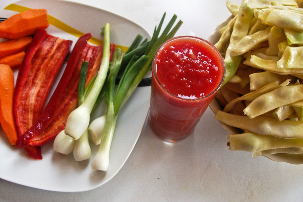 Se indeparteaza coditele si atele pastailor de fasole,se rup in jumatate si se spala bine sub jet de apa.Ceapa,ardeiul si morcovul se calesc in putin ulei incins,iar apoi se adauga fasolea si sucul de rosii,se completeaza cu apa,in jur de 1 l,atat cat sa acopere legumele si se lasa sa fiarba in jur de 30 minute.Cand a fiert se condimenteaza mancarea dupa gust si se presara verdeata tocata din abundenta,se serveste fierbinte cu salata de rosii sau muraturi.